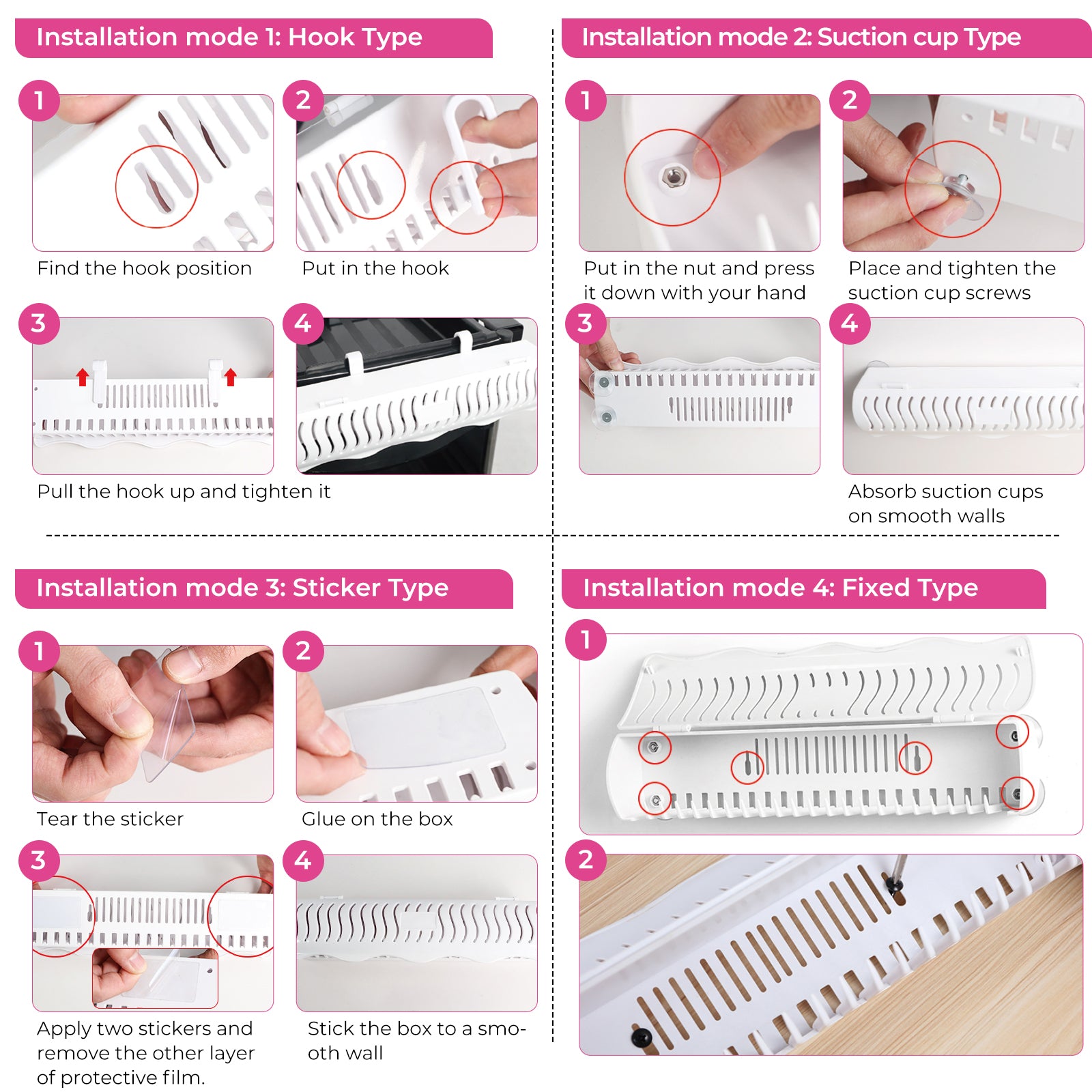 Perfect for different surfaces and scenarios. Comes with:- 4x double-strength suction cups- 2x strong adhesive stickers- 2x hooks- 4x screws