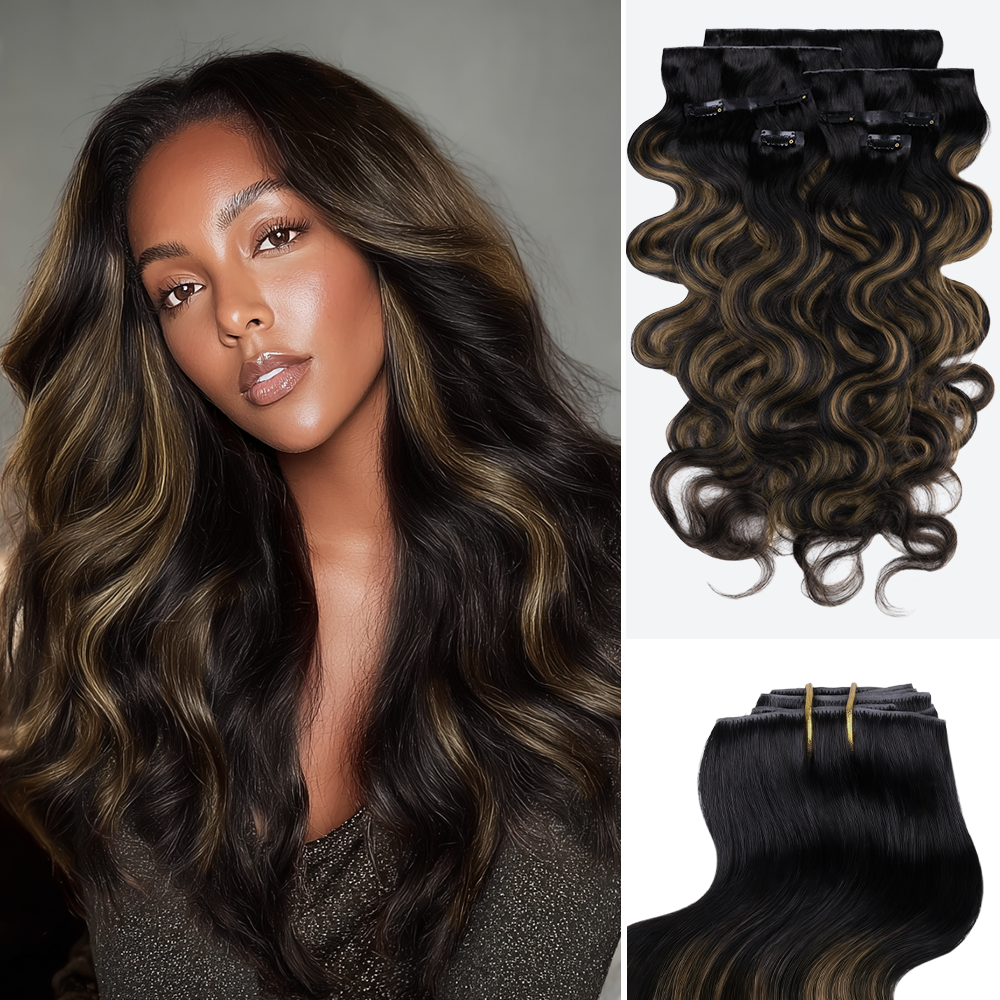 Lashey 1B/6/1B Body Wave Invisi Edges seamless clip-in hair extensions, designed to mimic hair growing directly from your scalp. Each strand is hand-tied to the weft for an undetectable finish that blends seamlessly with your natural hair. Crafted from premium human hair, these extensions are soft, smooth, and tangle-free, allowing you to dye, style, and heat-treat them just like your own hair. The secure, lightweight clips are gentle on your scalp and hair, ensuring all-day comfort without damage. Easy to apply and remove, these extensions deliver instant length, volume, and thickness in minutes.